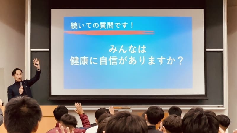 ▲「健康に自信がありますか?」という代表の質問に挙手する学生たち。